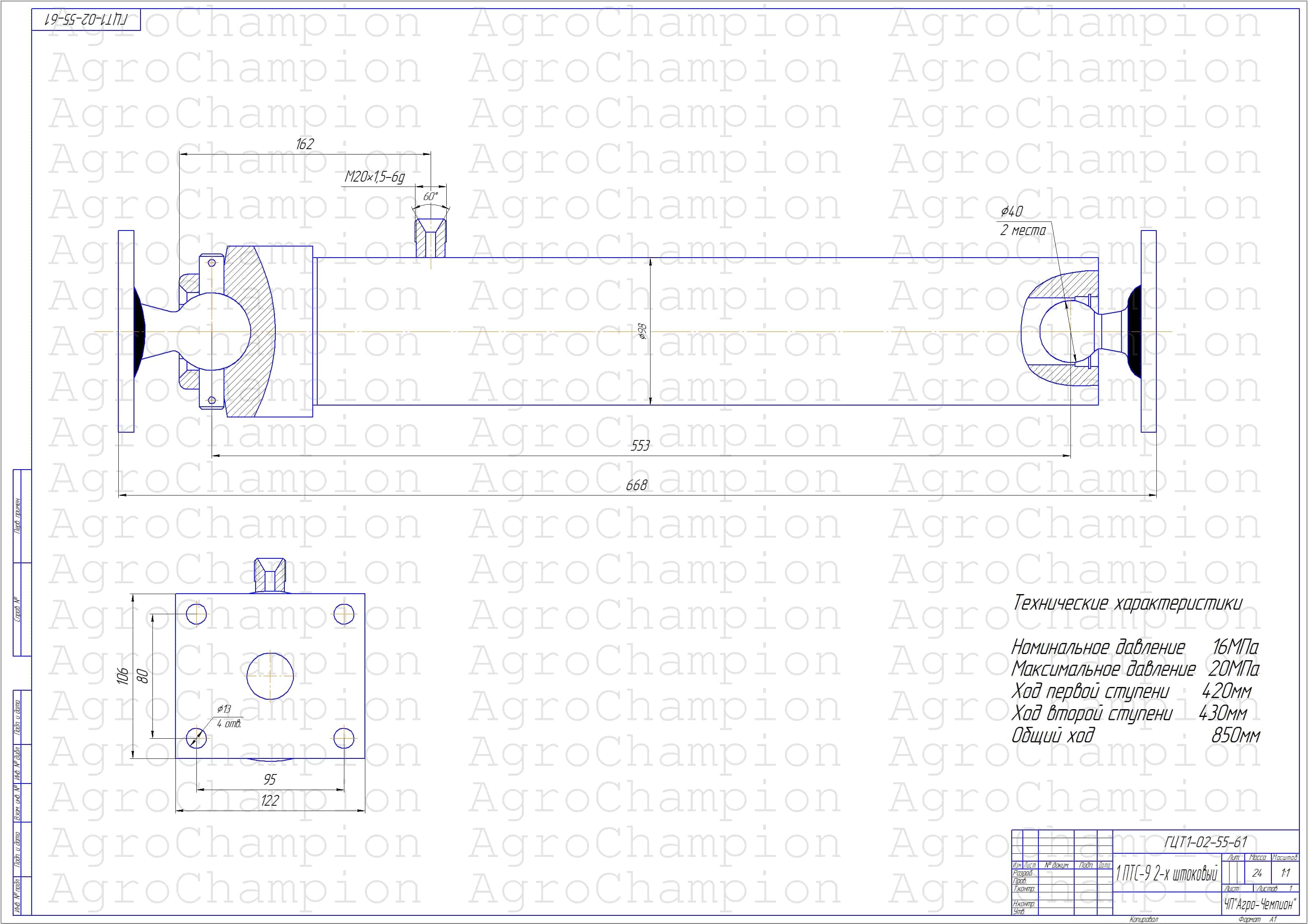 Общий ход гидроцилиндра 850 мм.